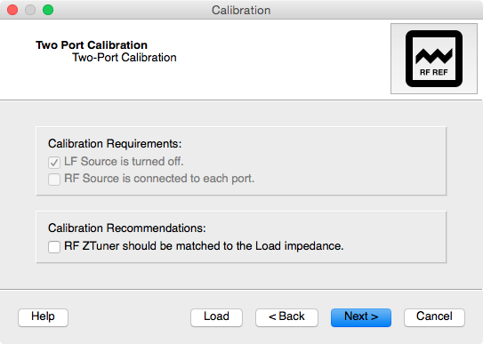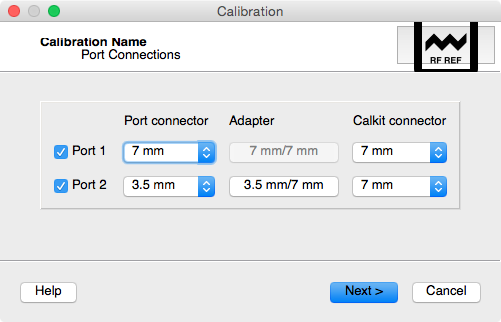 Select the ports to be calibrated and the “Next” button will become enabled when the required number of ports are selected. Select the Port connector for each measurement port and the Calkit connector for calibration kit that will be used during the calibration routine. If the Port connector does not match the Calkit connector, you will be prompted to specficy a two-port S-Parameter model of an adapter that is connected to measurement port during calibration.